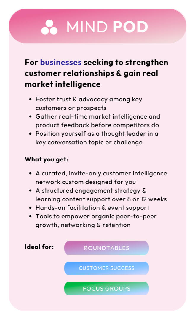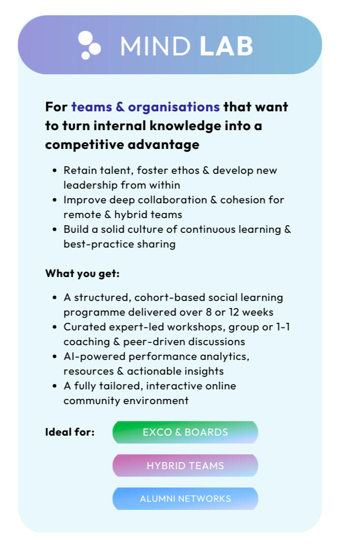 Welcome to the future of engineering purpose-built, tight-knit communities of influence.Powered by the four pillars of social learning, Mind Pods and Mind Labs are revolutionary new ways of activating solid networks of connection & knowledge.Humble Mind supports you to create from scratch or enhance existing communities to engineer psychologically secure, high-value environments where knowledge flows, relationships deepen and business outcomes improve measurably.